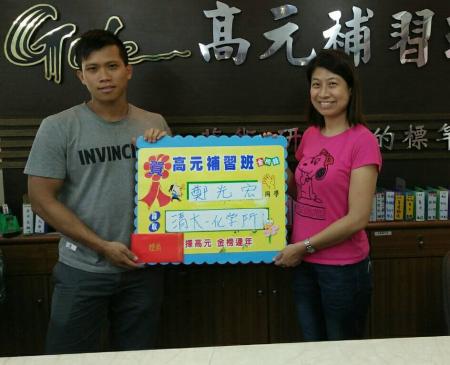 很開心能考上研究所。上高元補習班彌補我在大二那段不認真的時光,潘奕(潘己全)老師準備的東西很多,而且也可以盡量問老師問題,只要把課本裡的題目都做完,各有大學的有機、無機都能得心應手。李彭展(李安成)老師上課條理清楚又幽默風趣,讓許多人能真正認識物化。我認為只要從暑假開始就認真聽課,並在課後複習,必定能考上理想的研究所。 |